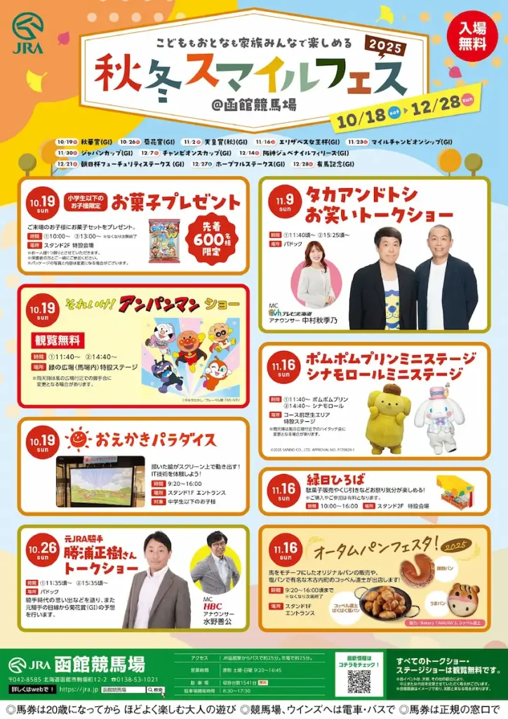 函館競馬場では12月28日(日)まで、「秋冬スマイルフェス」を開催しています。子どもから大人まで、家族みんなで楽しめるイベントが盛りだくさん!11月9日(日)は北海道出身のお笑いコンビ「タカアンドトシ」によるトークショー、11月16日(日)はポムポムプリンとシナモロールのミニステージを開催します。11月2日(日)には3~12歳対象のポニー体験乗馬(先着30名/イベント参加アプリから申込必要)、11月6日(木)には馬をモチーフにしたパンが並ぶ「オータムパンフェスタ」や「おみくじ付き馬券で運試し!」も実施。期間中は「クイズラリー」や「秋のスマイル抽選会」「秋の大抽選会」など、景品が当たるチャンスも!家族そろって、秋の競馬場を楽しんでください。※天候等により内容が変更・中止となる場合があります。