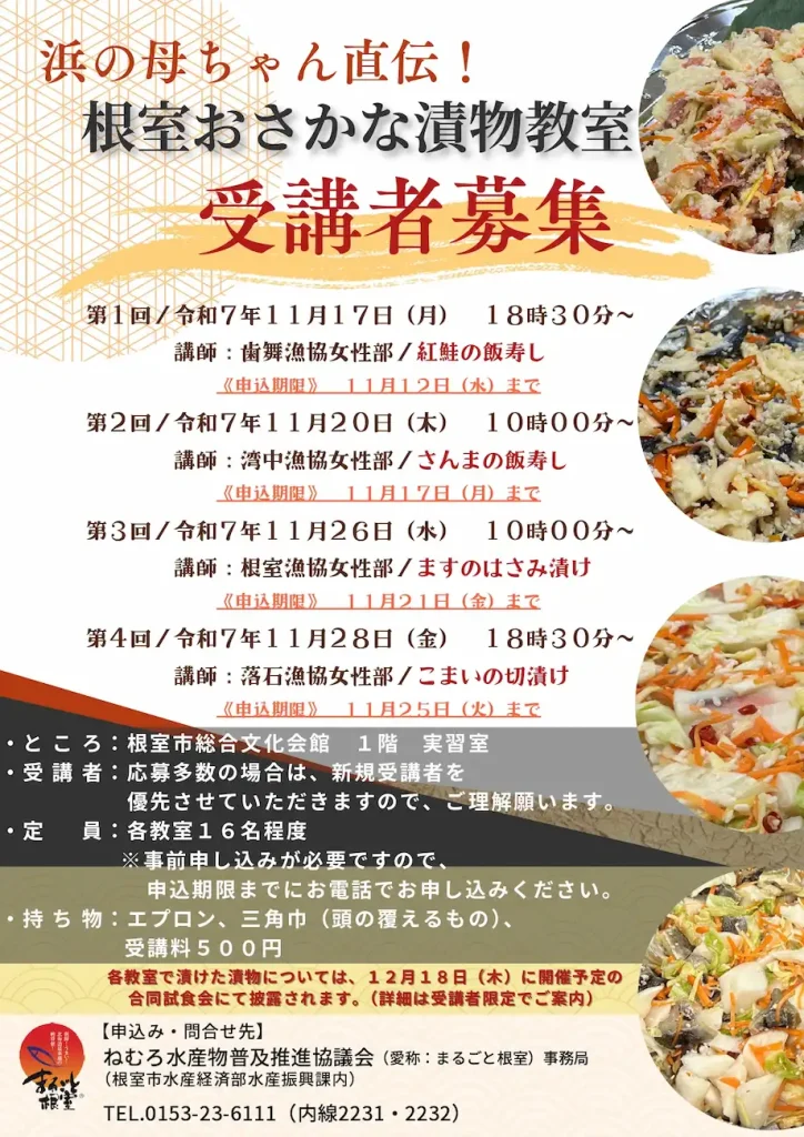 - 15 浜の母ちゃん直伝!根室おさかな漬物教室 ※11/17(月)、11/20(木)、11/26(水)、11/28(金)/根室
