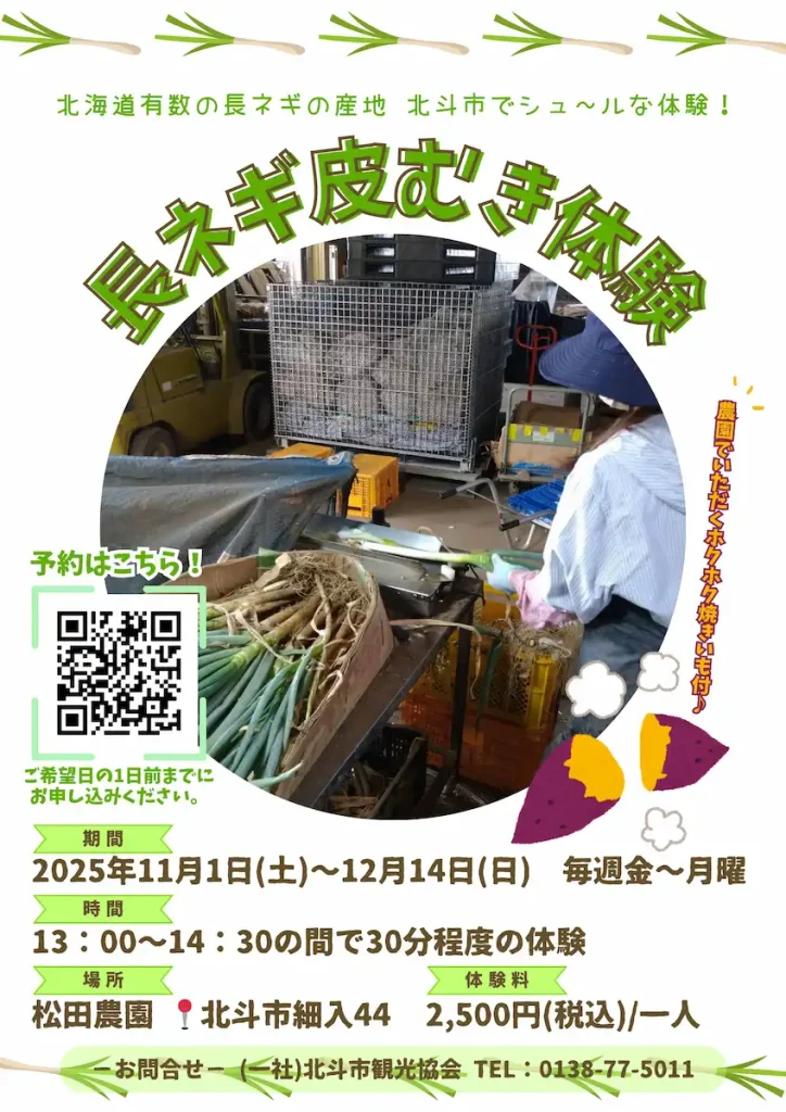 北海道有数の長ネギ産地・北斗市で、ちょっとユニークでシュ~ルな「長ネギの皮むき体験」に挑戦してみませんか?専用の機械を使って“シューッ”とむく爽快な体験はここだけの楽しみ!松田農園では、収穫・追熟された甘みたっぷりの焼きいももご用意。体験とあわせて、秋の味覚も楽しめます。直売所では旬の野菜も購入でき、お土産探しにもぴったり。新函館北斗駅近くの農園なので、11月30日までレンタル可能なEバイクでのアクセスもおすすめです。北斗市ならではの味覚とユニークな体験を満喫できる、“おいしいひととき”を体感してください。