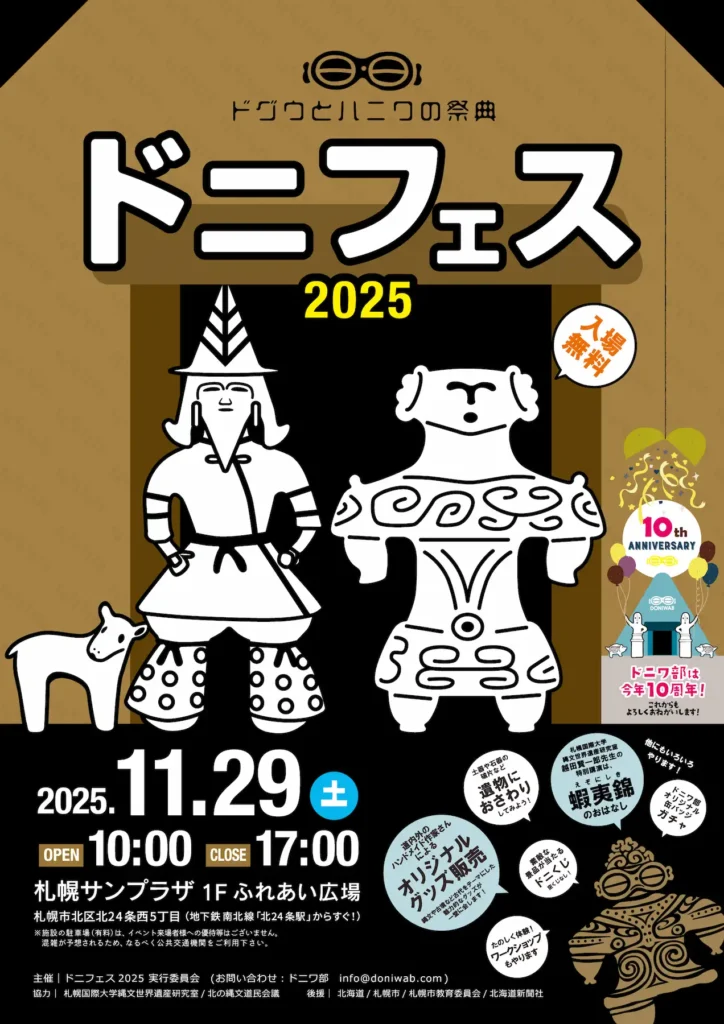 縄文?弥生?古墳?石器?なんだか難しそう…と思ったあなたも大丈夫!「ドニフェス2025」は、土偶やハニワを“なんかカワイイ”って思った人から、“縄文の細石器が好き!”なんてマニアな方まで、みんなでゆる~く楽しめるイベントです。ドニワ部員による手づくり土器や土偶の展示、専門家の先生による楽しいお話、そして子どもも大人も夢中になれるワークショップが盛りだくさん。オリジナル雑貨やハンドメイド作家さんの縄文グッズもずらりと並びます。見て、作って、学んで、笑って──古代の文化がちょっと身近に感じられる一日。土偶もハニワもよくわかんないけど気になる、その気持ちがあればOK!今年もドニフェスで、“ドニワの世界”をのぞいてみませんか?