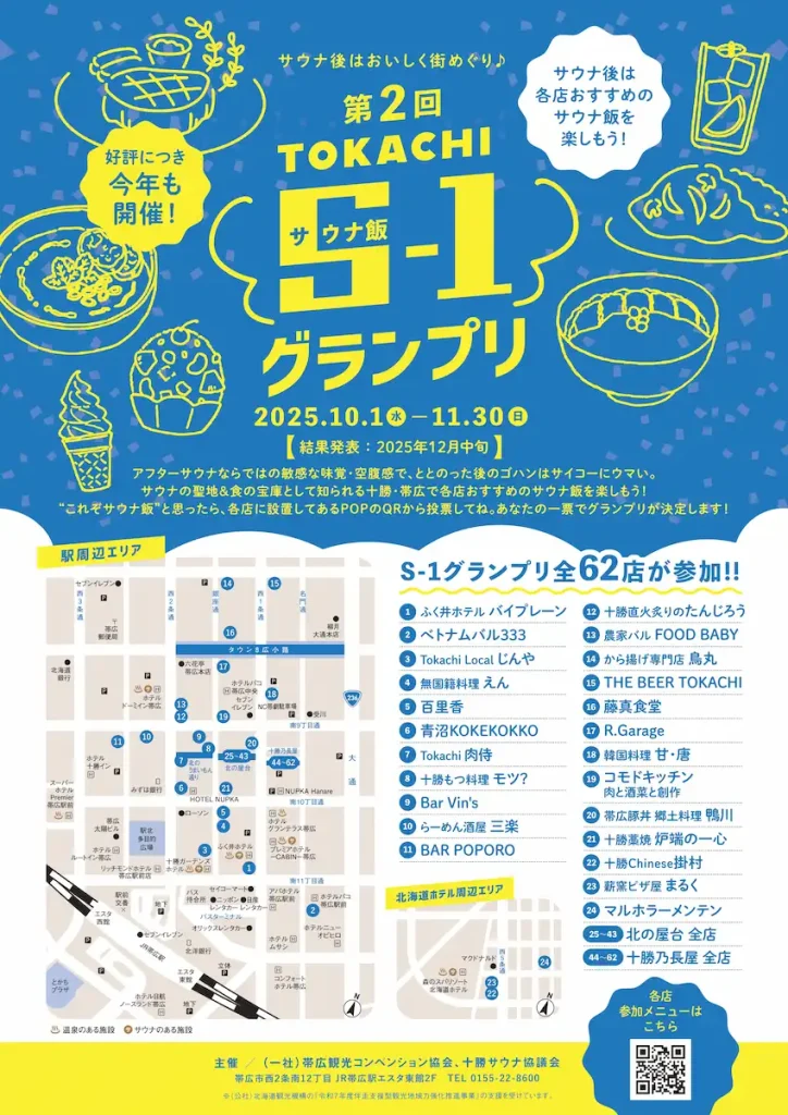 昨年大好評だった「TOKACHI S-1グランプリ(サウナ飯-1)」が、今年も開催されます。JR帯広駅周辺の全62店舗がエントリーし、サウナ後の“ととのった”感覚で味わいたい「サウナ飯」をテーマに、各店が趣向を凝らしたメニューを提供。スパイシーな料理で〝追い汗〟をかける一皿や、爽やかにクールダウンできるドリンクなど、バラエティ豊かなラインナップが楽しめます(参加店メニューはこちら)。