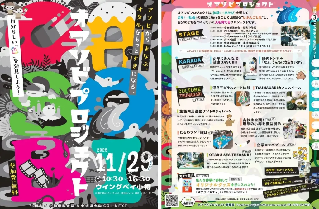 「オアソビプロジェクト」は、体験(=遊び)を通してまち(=社会)の課題に触れ、それを“じぶんごと化”することで、自分たちのまちをつくっていく人を育てるプロジェクトです。「STAGE」では、ダンスや吹奏楽、YOSAKOIなど、参加者が自分らしさを表現するステージを展開。「KARADA」では、家族で楽しめる体力テストや、食の仕組みを学べる「腸内トンネル」体験を実施します。「CULTURE&TSUNAGARI」では、シーグラスアクセサリーづくりや高校生による「理想の小樽」模型展示などを通して、文化と人のつながりを育みます。そのほか、施設内周遊型の「ナゾトキチャレンジ」や「浮き玉ガラスアート体験」、ボードゲームを通じて交流できる「TSUNAGARIカフェスペース」など、楽しい企画が盛りだくさん。体験を3つ楽しむと「オアソビガチャ」に挑戦できる特典も!あそびを通して小樽の魅力を再発見しよう。