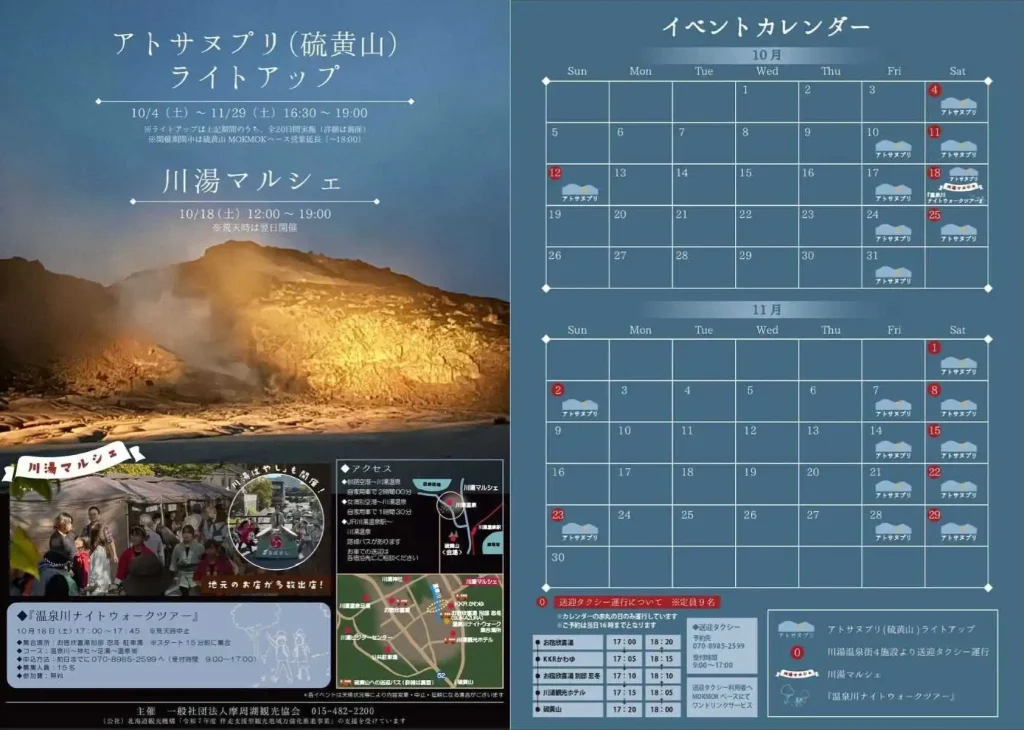 2025年10月4日(土)から、川湯温泉で毎年恒例の「アトサヌプリ(硫黄山)ライトアップ」が始まります。18日(土)は地元のうまいものが集合する1日限りの「川湯マルシェ」も開催され、にぎやかな太鼓の川湯ばやしも披露されます。