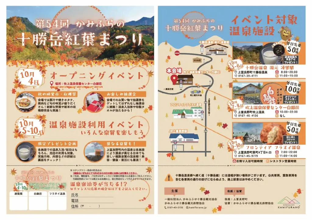 【会場】 〈オープニングイベント〉吹上温泉保養センター白銀荘 〈スタンプラリー対象施設〉吹上温泉保養センター 白銀荘、十勝岳温泉 湯元 凌雲閣、フロンティア フラヌイ温泉 |