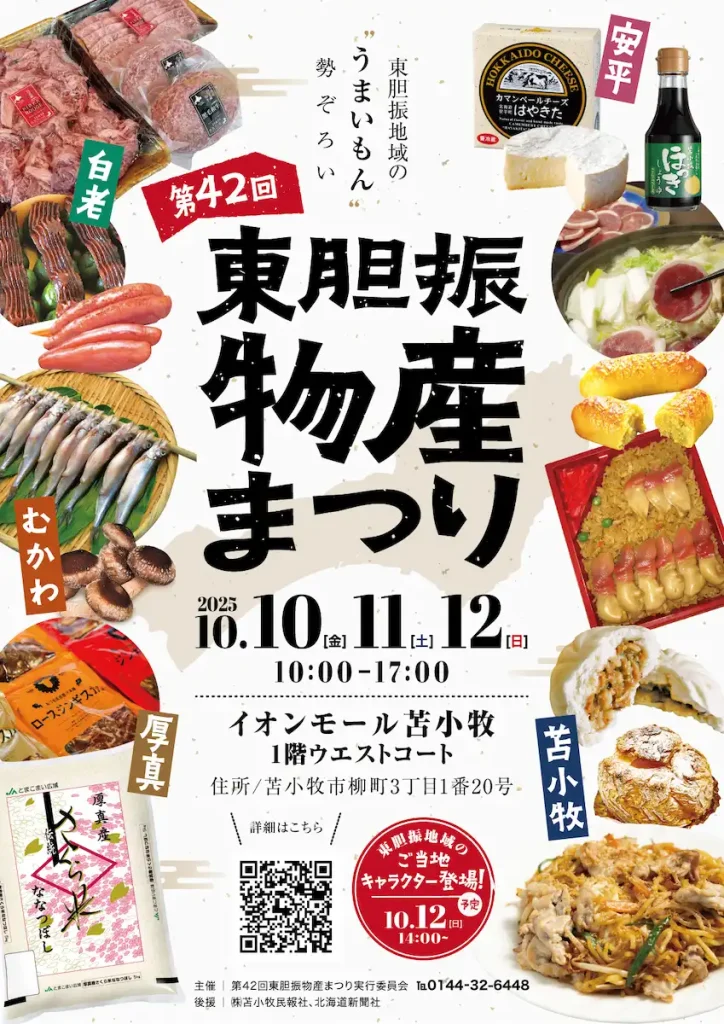 本イベントは、東胆振地区の1市4町(苫小牧市・白老町・安平町・厚真町・むかわ町)が一堂に会し、各地域の自慢の特産品を販売する物産展です。会場には、ホッキ貝を使用した特産品や、むかわ町のししゃも、白老町の牛肉など、地域ならではの食材や加工品が揃い、東胆振の魅力を広く発信します。また、10月12日(日)11時からは、東胆振地区のご当地キャラクターも登場予定です。