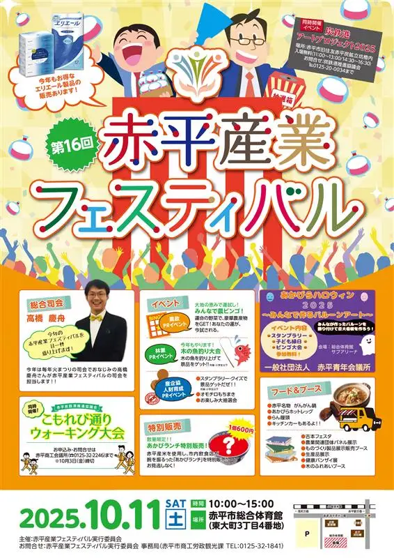 「赤平産業フェスティバル」は、「ものづくりのまち」赤平市の魅力を発信するイベントです。市内の農業・商業・工業が一堂に会し、特産品や製品の展示・販売を行います。会場では、人気の「あかびランチ」の特別販売やエリエール製品販売、子ども向けの「農ビンゴ」や「木の魚釣り大会」、もちまき大会など多彩な企画を実施。さらに、赤平企業の製品が当たるお楽しみ抽選会や古本フェスタ、健康測定や相談ができる「健康バンザイ展」など、家族で楽しめる内容が盛りだくさんです。総合司会は火まつりの司会でおなじみの高橋慶舟さんが務めます。