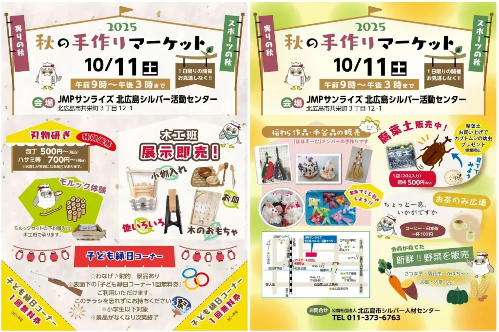 「秋の手作りマーケット」は、北広島市シルバー人材センターが開催する恒例のイベントです。会場では、小物入れやお皿、椅子などの木工作品をはじめ、手芸品や箒などの販売を実施します。毎年好評の刃物研ぎコーナー(お渡しが翌週になる場合あり)や、会員が育てた新鮮秋野菜や腐葉土の販売、「お茶のみ広場」でのコーヒー・日本茶の提供もあります。さらに、輪投げや射的、ストラックアウトなどの子ども縁日コーナー、人気のモルック体験も行われ、家族みんなで楽しめる内容です。