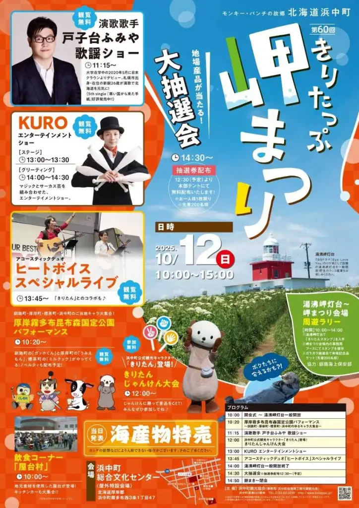 「きりたっぷ岬まつり」は浜中町の秋の一大イベントで今年で60回目。浜中町公式観光キャラクターの「きりたん」とのじゃんけん大会や、釧路町の「ガッホくん」、厚岸町の「うみえもん」、標茶町の「ミルクック」が大集合します。