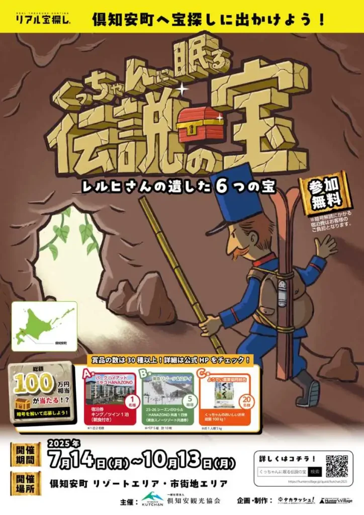 北海道・倶知安町が舞台のリアル宝探しイベント「くっちゃんに眠る伝説の宝 〜レルヒさんの遺した6つの宝〜」が開催されています。参加は無料で、宝を見つけた人の中から抽選で、総額100万円相当の豪華賞品が当たります。
