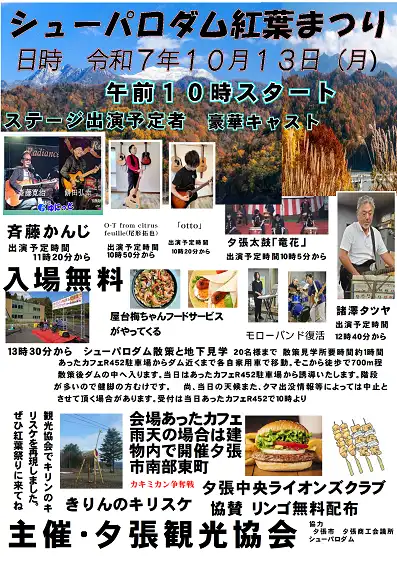 夕張シューパロダムは日本で2番目に大きい湛水面積(満水時の水面面積)を誇るダムです。雄大な水面と紅葉に彩られた抜群のロケーションを堪能できます。自然だけではなく、地元の市民団体等によるステージイベント、フードの出店もあり、グルメも楽しめます。また、20名限定でシューパロダム散策と地下を見学できる「シューパロダム内部探索ツアー」も開催されます。
