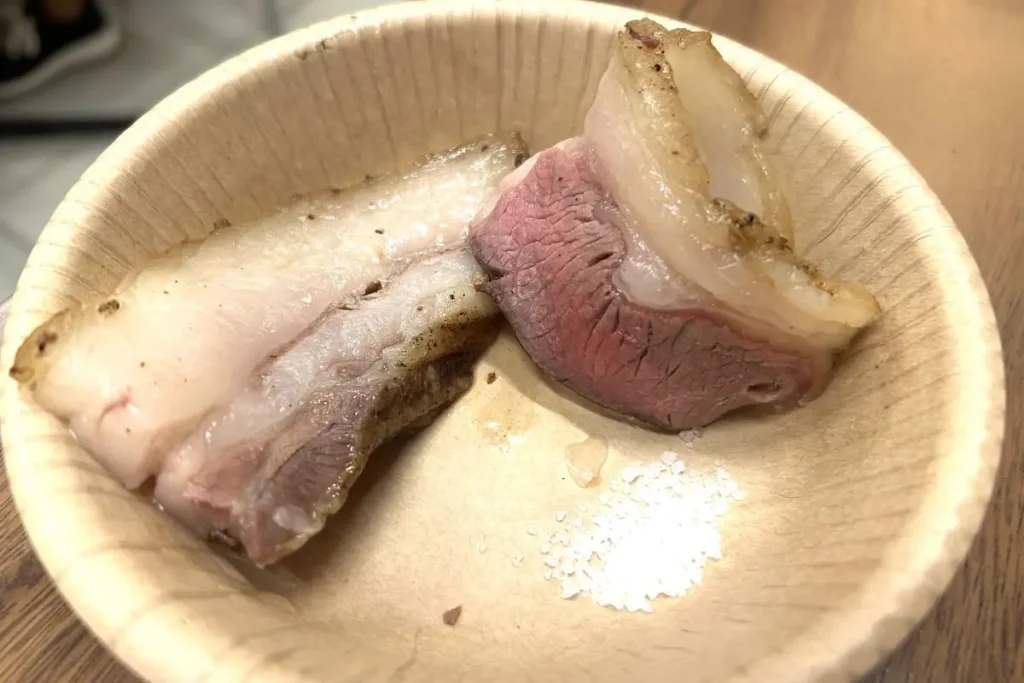 バラ肉は、脂身が半分以上かというほどたっぷり付いていて、かみ応えがあり、かめばかむほど、うまみが出てきます。赤身部分はしっかりした肉質ですが、ジューシーで、おいしさが詰まっています。