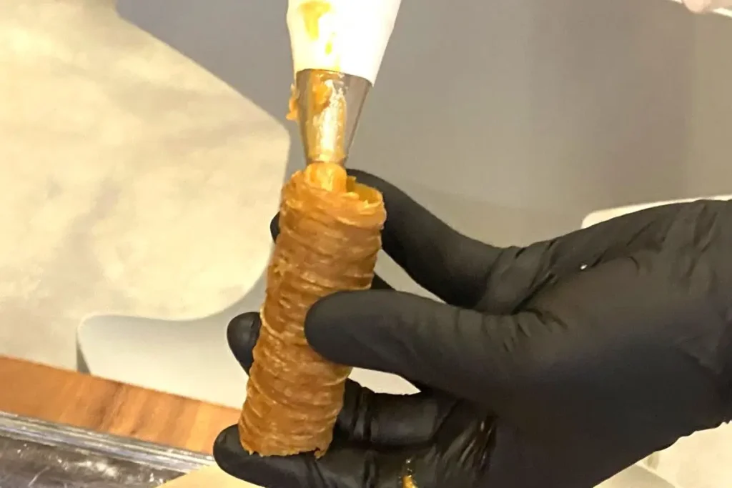 この日のスペシャリテは、「オホーツク毛がにのコロッケ 発酵白菜クリームとグラナディエゾ」。刺身のつまをつくるカッターでジャガイモを細くカットし、真ん中が空洞の円柱状にして揚げます。その中に、食べる直前に毛がにを使った濃厚なビスクソースを詰め、ソースのふた代わりに、イタリアのハード系チーズ「グラーナ・パダーノ」に似た北海道産生乳100%のチーズ「グラナディエゾ」を削って付けます。下国シェフがひとつずつ詰めてサーブしてくれ、外側の揚げジャガイモがサクサクのうちにいただきます。下国シェフが「大好きなカニクリームコロッケを思い浮かべながら考案しました」と言う通り、まさにカニクリームコロッケですが、カニの身もたっぷり入り、ビスクソースが濃厚で、よりぜいたくで上品な一品です。