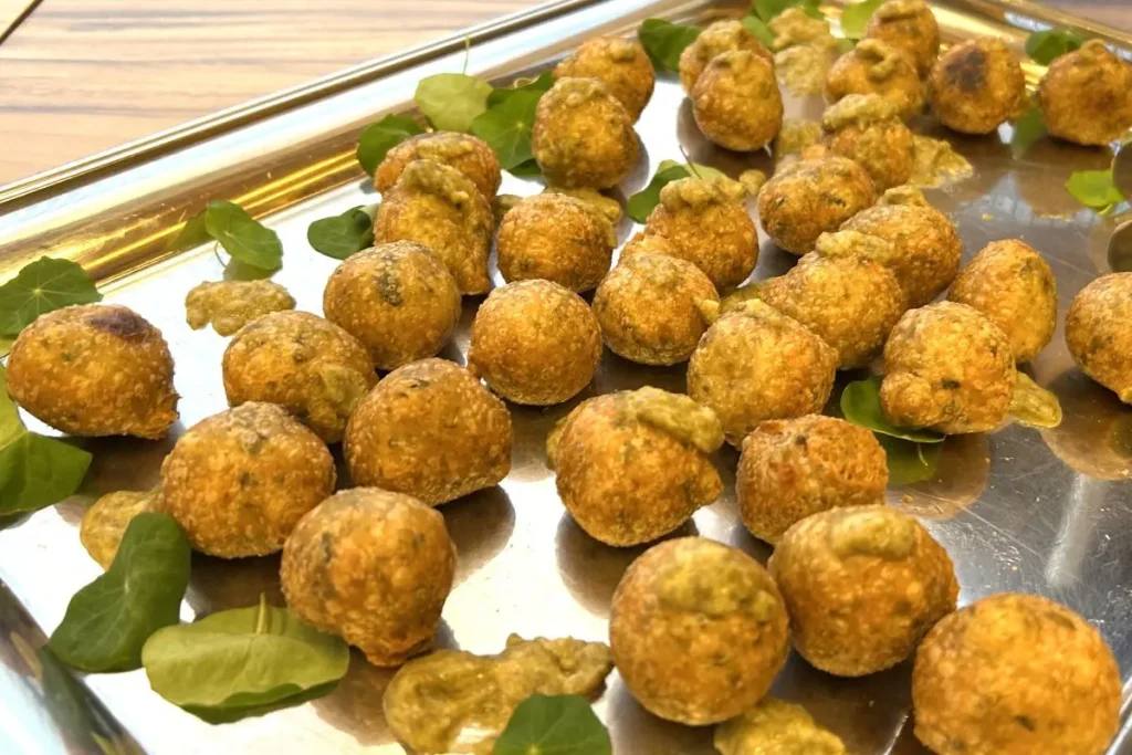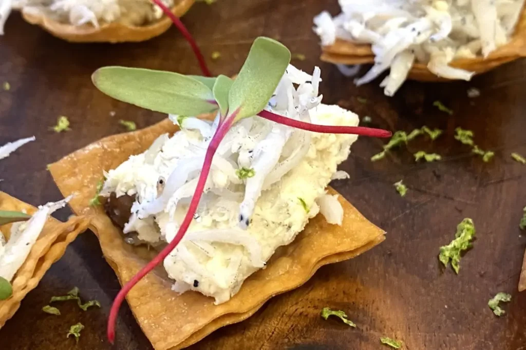 屋外BBQで火をたくみに操り、肉を仕上げる堂本シェフに対し、下国シェフはセンター棟でブッフェスタイルで提供する料理を担当。メインが和牛とサフォークのため、野菜や魚介を中心にメニューを組み立てたそう。サウナを楽しむ人も多いため、ととのった後にさわやかに食べられるメニューをラインナップしました。