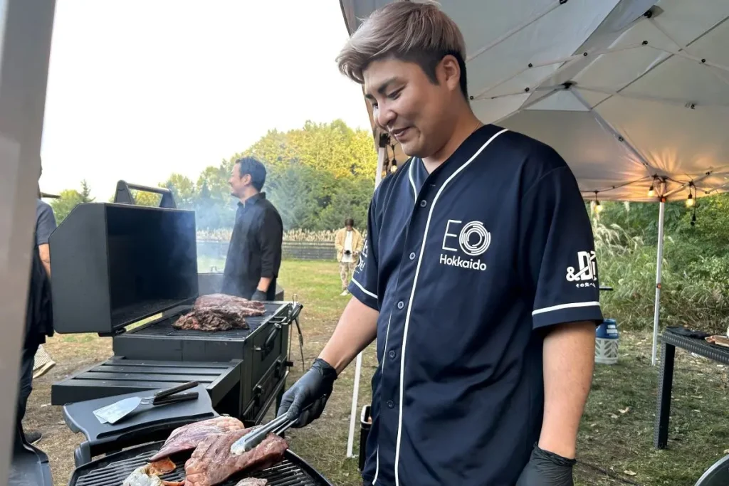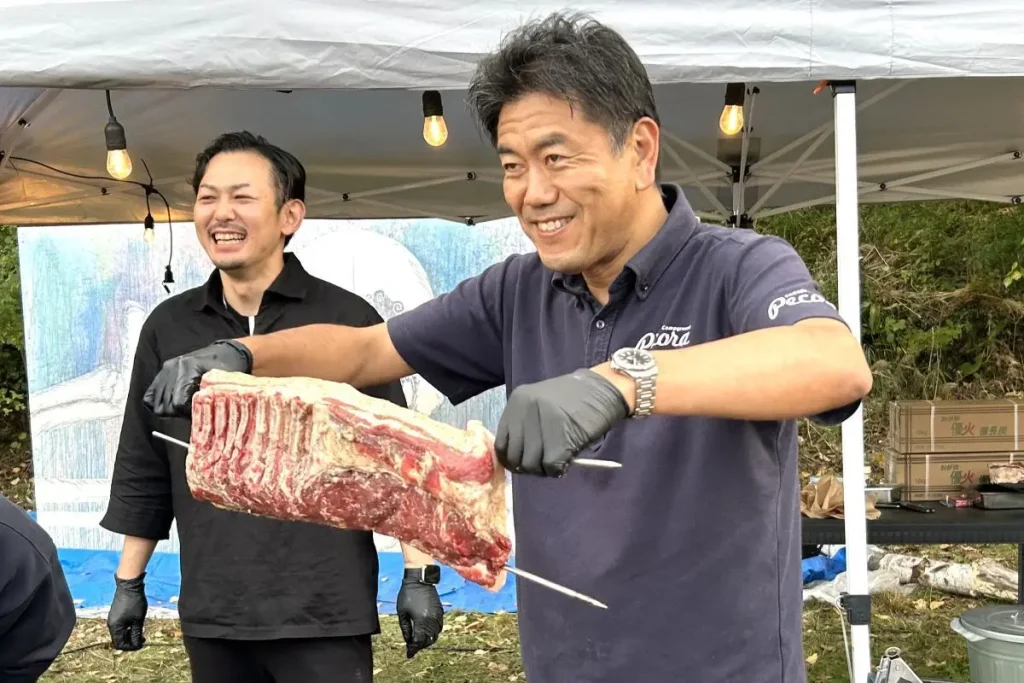 芸森ワーサム代表の大森祥太さんと、野外バーベキューで肉の調理を担当した札幌市中央区の鉄板焼き専門店「ヤナギ・テッパン・アンボーン・ガストロノミー」(南4条西5丁目F-45ビル8階)シェフの堂本靖二さんが企画。肉以外の調理は札幌市内の老舗フレンチ「コートドール」元料理長のフレンチシェフ下国伸さんが担当しました。知床牛を生産するカネダイ大橋牧場(大空町)社長の大橋遼太さん、士別サフォークを生産するPecoraFarm(ペコラファーム)代表の山下卓巳さんも来場しました。