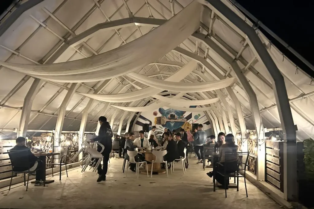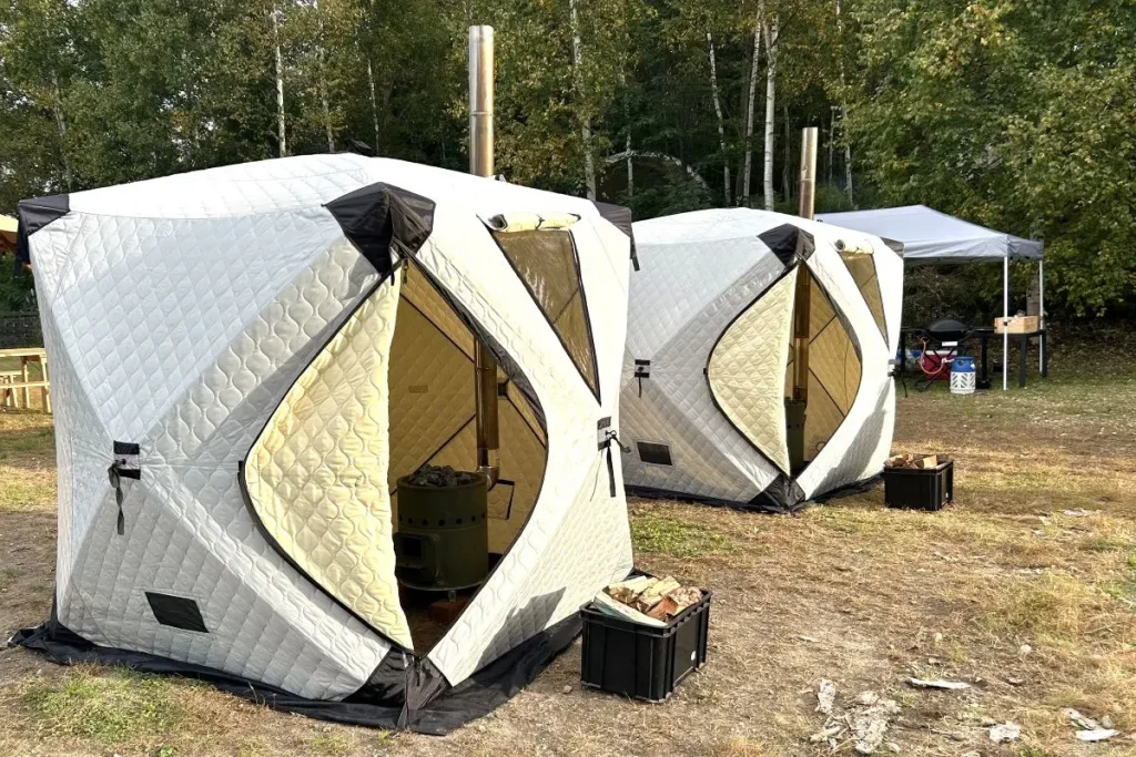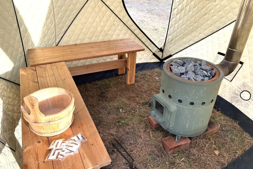 会場には、肉に火入れするため薪や炭をおこしたBBQコーナーや屋根付きでDJによるミュージックが流れるバンケットテントのほか、サウナテント2基と水風呂も設置。約80人が参加し、思い思いに食事やサウナを楽しみました。