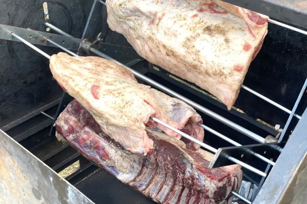 ホゲットはクルクルと回転させながら、炭火ロースターで1時間半ほどかけてグリル。ゆっくり、じっくりとグリルすることで、脂にしっかり火が通り、うまみがぎゅっとつまっています。ロースの赤身はしっかり締まっていますが固くはなく、歯切れも良し。赤身部分は羊肉らしい香りと味わいがあり、脂もしっかり付いていますが、くどさは感じず、甘さとうまさがあります。