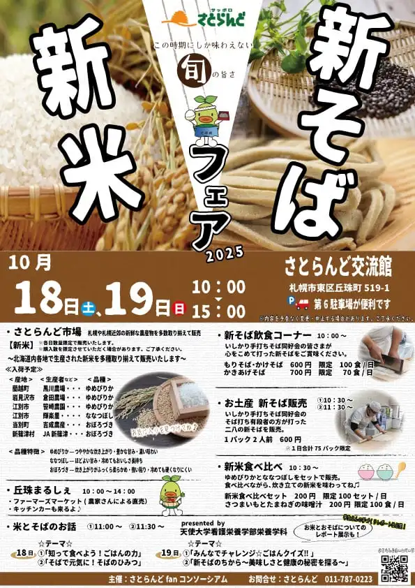 札幌市農業体験交流施設サッポロさとらんどで、「新米・新そばフェア2025」を開催します。道内各地から届く新米を販売するほか、農家直売のファーマーズマーケットやキッチンカーも登場。いしかり手打ちそば同好会による打ち立てのもりそば・かけそば・かきあげそばが味わえるほか、数量限定でお土産用の二八そばも販売します。さらに、ゆめぴりかとななつぼしの食べ比べや、炊き立てごはんと味噌汁の試食も楽しめます。天使大学の学生による米とそばの魅力を学べるミニ講座も実施。秋の味覚を満喫できるイベントです。