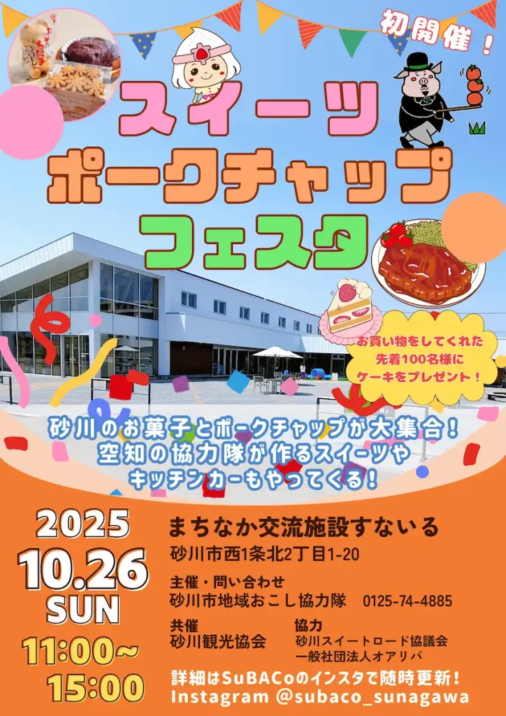 「スイーツ・ポークチャップ フェスタ」は、砂川の名物グルメ“スイーツ”と“ポークチャップ”を一度に楽しめるイベントです。会場「すないる」には、地元店のポークチャップやスイーツが大集合!食べ比べやお買い物が楽しめるほか、キッチンカーや地域おこし協力隊の出店も登場します。炊きたての新米ごはんも用意され、その場で味わうのはもちろん、お持ち帰りもOK。11時からはもちまきも開催されます。さらに、スタンプラリーで3か所以上のブースを巡ると、先着100名様にケーキをプレゼント!また、ポケモンがデザインされたマンホール蓋「ポケふた」のお披露目式も同日開催されます。初開催となる砂川市の新たなグルメイベントとして、見どころ・味どころ満載の一日です。