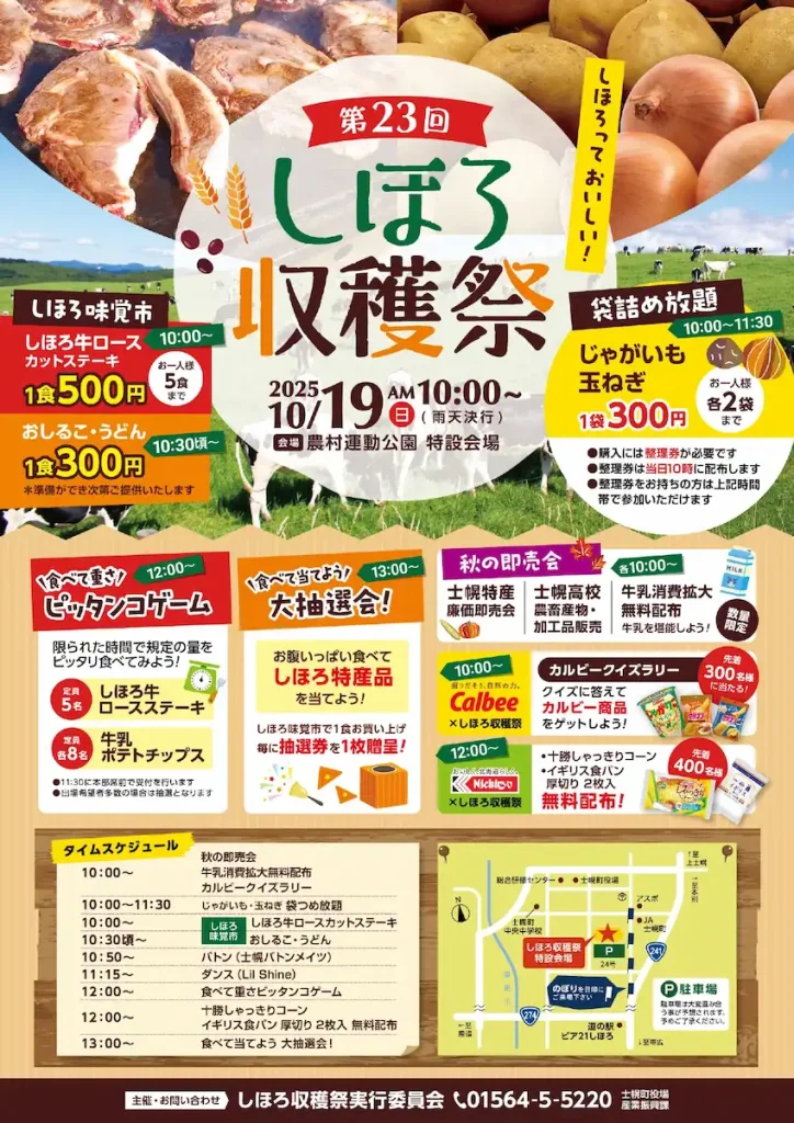「第23回しほろ収穫祭」は、士幌町の秋の味覚を存分に楽しめるイベントです。会場では、町特産品の販売をはじめ、「しほろ味覚市」でしほろ牛ロースカットステーキ(1食500円・お一人様5食まで)やおしるこ、うどん(1食300円)などを味わえます。さらに、1袋300円で参加できるじゃがいも・玉ねぎの袋つめ放題、食べて重さを当てる「ピッタンコゲーム」、抽選会など多彩な企画も実施。場内では牛乳やパンの無料配布も行われます。各コンテンツのスケジュールは公式サイトやチラシでご確認ください。実りの季節を迎えた士幌の魅力を満喫できる一日です。
