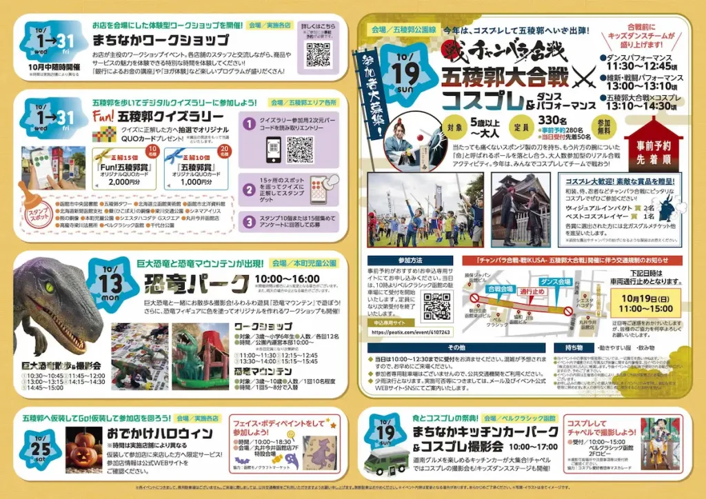 「五稜郭まちなかフェスティバル」は、函館市の本町・五稜郭・梁川エリアを舞台に、地域の魅力を発信し、まちなかに賑わいを生み出すイベントです。期間中は、各店舗での「まちなかワークショップ」や「Fun!五稜郭クイズラリー」、チャンバラ合戦、コスプレ撮影会やダンスパフォーマンス、キッチンカー出店、ハロウィン企画など、バラエティ豊かな催しが行われます。地元の人や観光客がまちなかを巡りながら、ヒト・モノ・コトの魅力に触れ、五稜郭エリアの新たな魅力を体感できるイベントです。参加申し込みやタイアップイベント、会場マップなどイベントの詳細は、公式サイトをご確認のうえお楽しみください!
