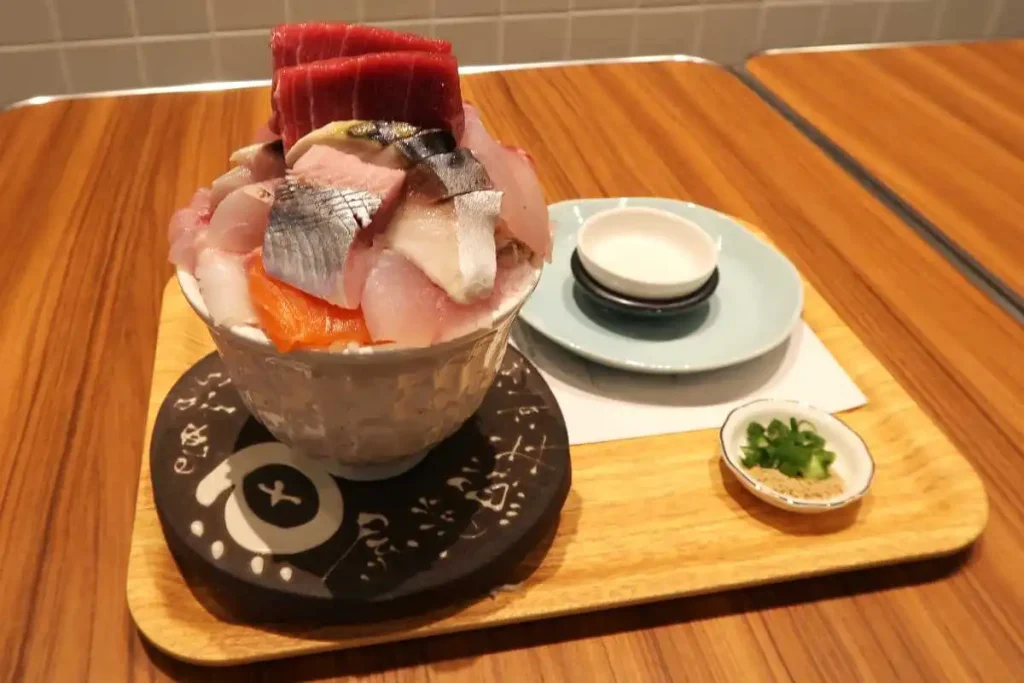 1番人気は「本日の海を感じる名物鮮魚12種丼」(1859円)。丼には、大ぶりにカットされた刺身が、まさにてんこ盛り。「12種」とうたってはいるものの、仕入れによって、いつも15種類ほどは入っているそう。このまま食べると崩れてしまったり、ご飯になかなか行き着かなかったりするので、具を移しながら食べられるように皿が付いてくるという親切さです。
