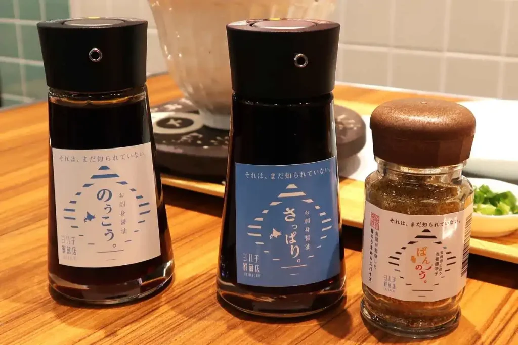 しょうゆや薬味にもこだわりが。水色のラベルの「さっぱり」のしょうゆは、白身魚やホタテなど、あっさりしたものによく合います。白いラベルの「のうこう」は少し甘めのとろっとした九州しょうゆ。マグロやしめさば、ブリなど脂ののった魚に合わせるといいそう。オレンジ色の粉状の調味料「ばんのう」は、ショウガとうがらし。道東の漁師町では、サンマやイワシなど青魚の刺身に一味唐辛子を合わせることから着想し、独自につくったそう。好みに合わせて味付けも選べます。