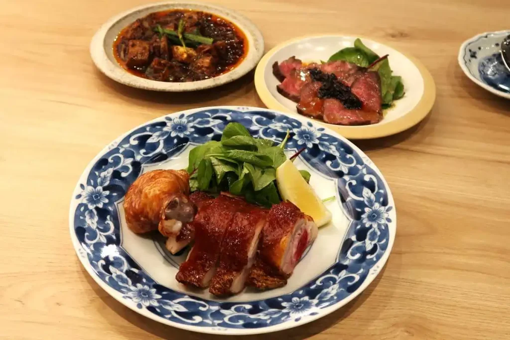 フラッグシップメニューは3品。「アーモンド香るよだれローストビーフ」(880円)は、しっとりジューシーなローストビーフにスパイシーな特製ソースをかけ、ナッツの香ばしい風味を加えています。「クリスピーチキン」(1280円)はミシュランで星をとった「中国菜エスサワダ」の看板料理。皮を香ばしくパリッと焼き上げ、身にはジューシーなうまみを閉じ込めています。「澤田流麻婆豆腐」は、豆板醤と赤味噌のこくの中に、四川山椒がぴりりと香る「定番中の定番」の味を提供します。