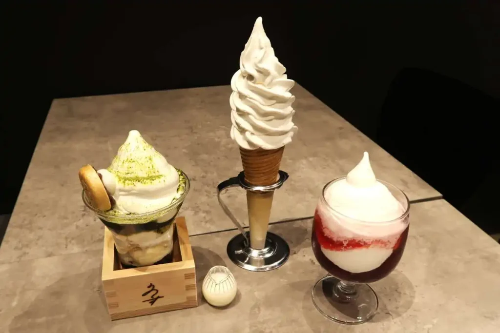 そのソフトクリームを使ったパフェ(850円)もお勧め。「苺とミルフィーユ」や「キャラメルナッツ」など5種類あり、例えば「和のパルフェ」は下から、サクサクのクランブル、抹茶ソース、カスタード、あんこ、ミルクアイス、パイ、エスプーマ、パイ、抹茶ソースと重ねた上にソフトクリームを載せており、白玉やもなかも入っています。さまざまな食感や味の違いを楽しむことができ、なかなかのボリュームですが、飽きずに食べられます。さらに、オプションのリキュール(200円)をかけると、大人の味わいです。