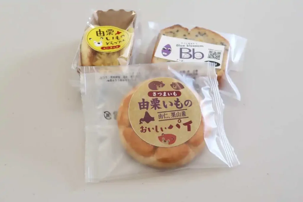 「由栗(ゆっくり)いも~そらち南さつまいもクラブ~」は焼きいものほか、サツマイモでつくったバターケーキ、どら焼きなどのスイーツを販売。「由栗いも」は由仁町と栗山町のサツマイモ農家約30戸がつくる紅あずまのブランド名で、会場では石焼きいものガス釜で焼き上げています。パウンドケーキ「ブルーブロッサム」はバターの香りたっぷりで、「由栗いものおいしいパイ」は栗のようなまろやかな甘さを感じます。
