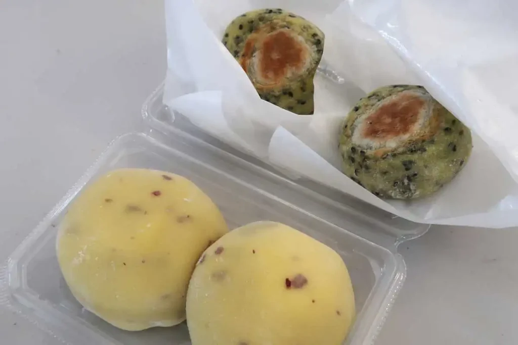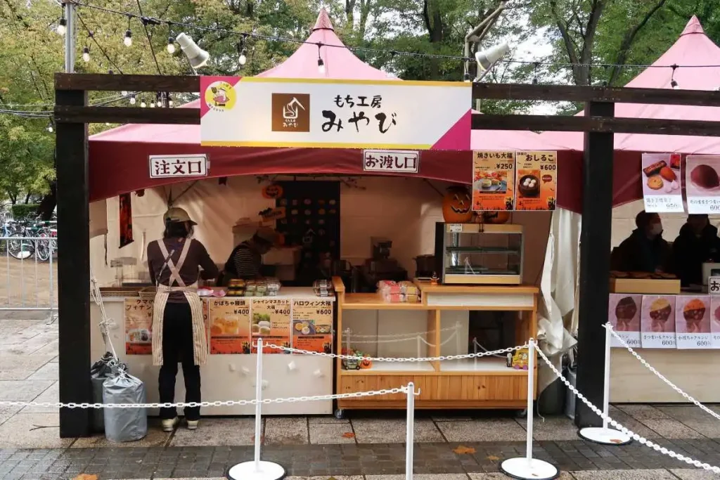 「もち工房 みやび」(札幌市北区)は、イベント限定の「餅屋のおしるこ」のほか、いもようかんやサツマイモのきんつばなどをそろえます。「焼きいも大福」は素朴な甘さで、たっぷりまぶされた黒ごまの香ばしさと食感がいいアクセント。「スイートポテト大福」はたっぷりのクリームとスイートポテトのフィリングが合わさって、まるでケーキです。