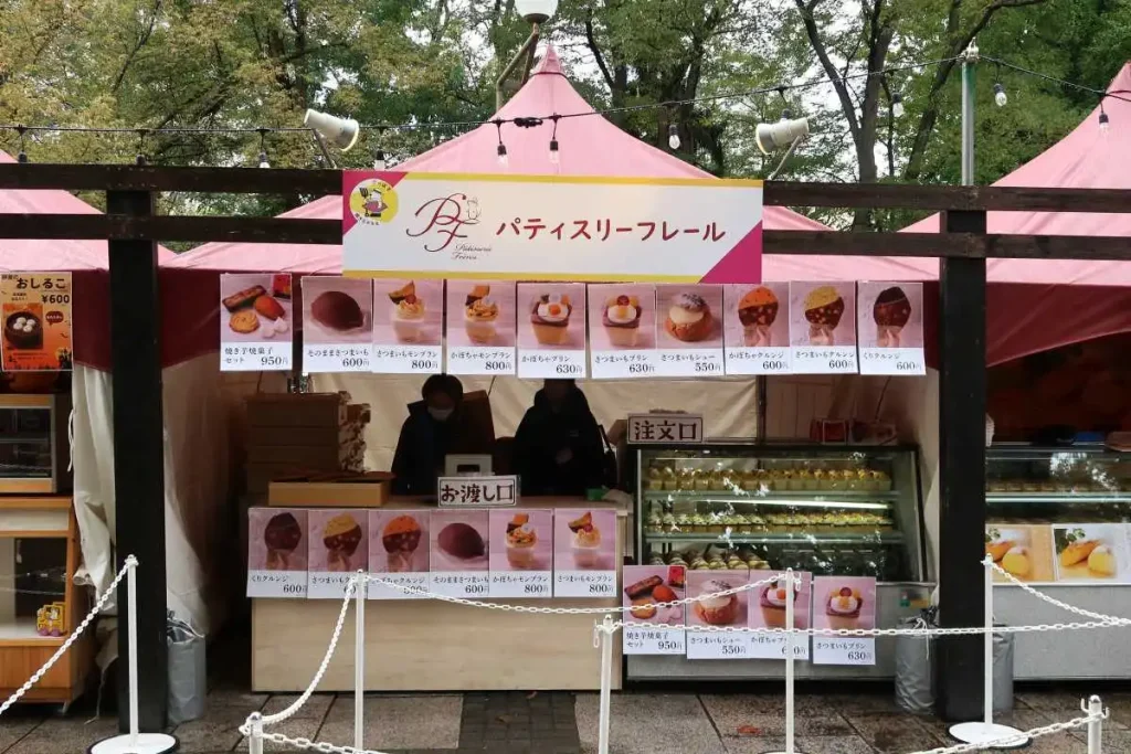 札幌市豊平区の人気ケーキ店「パティスリーフレール」は、昨年に引き続き、クロワッサンをプレスして30センチ以上に伸ばした韓国発祥の「クルンジ」などを用意。定番入りしているサツマイモ味のほか、会場限定で栗やかぼちゃもそろえます。焼き芋テラス限定のケーキ「さつまいもモンブラン」も販売しています。