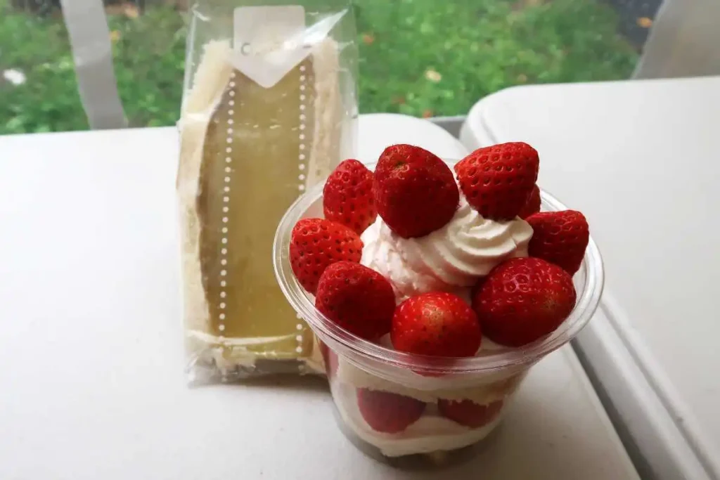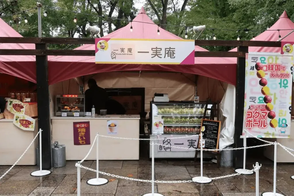 スイーツは初出店3店を含む5店が出店。初出店の「一実庵」(札幌市北区)は、焼き芋串やお汁粉などを販売。普段はフルーツに特化したフルーツサンドやスイーツを手がけており、今回はさつまいもサンドイッチを出品。断面は全面サツマイモという迫力ですが、生クリームもたっぷりはさまっています。サツマイモのねっとりとした甘さにクリーミーさが加わり、洋風なのに濃い緑茶やほうじ茶に合いそう。イチゴがたっぷりのったパフェなども人気を集めています。
