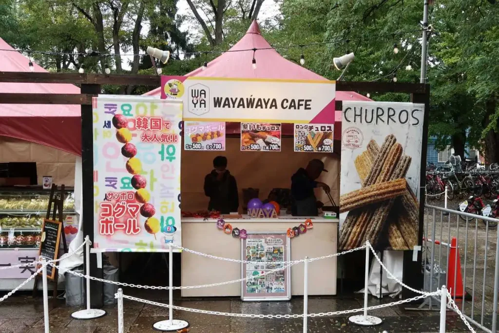 「WAYAWAYA CAFE」(札幌市白石区)も初出店。紅芋チュロスや韓国で人気のサツマイモスイーツ「コグマボール」を販売しています。コグマボールはもちっとした生地でスイートポテトペーストを包んだ小さなボール状のお菓子を串に刺して揚げたもので、「コグマ」は韓国語でサツマイモのことだそう。