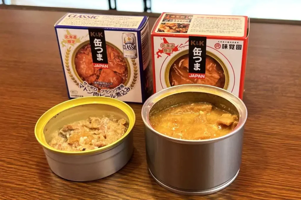 焼き芋テラスの会場には、囲い付きの飲食用テントが並び、ストーブも設置されていますが、「やきいも酒場」には立ち飲み用のカウンターもあります。ビールや芋焼酎のほか、日本酒やワインも販売。おつまみとしては、缶詰メーカー国分の「缶つま」シリーズを用意しています。サッポロクラシックを使った北海道限定の「マトン肉のビール煮込み」や北見市の焼き肉店「味覚園」監修の「北海道産牛もつ煮味噌味」など、お酒の進む缶詰が並びます。
