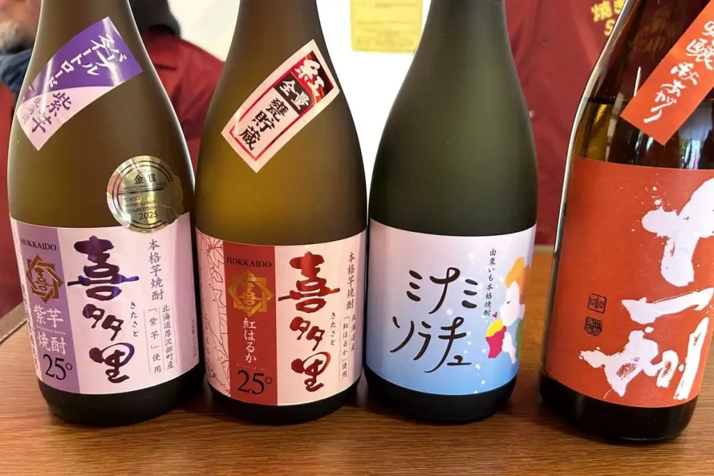 サツマイモの焼酎は4種類。由仁町と栗山町で生産されているブランドサツマイモ「由栗いも」を使って、日本清酒に委託醸造した「ミナミソラチュ」は焼き芋テラス限定。ほかに、北海道産紅はるかを使った「喜多里紅はるか」と北海道産の紫芋パープルスイートロードを原料にした「喜多里パープルスイートロード」、種子島産の安納芋の「炭火焼安納芋焼酎」も、それぞれロックや水割り、お湯割り、ソーダ割りで飲むことができます。