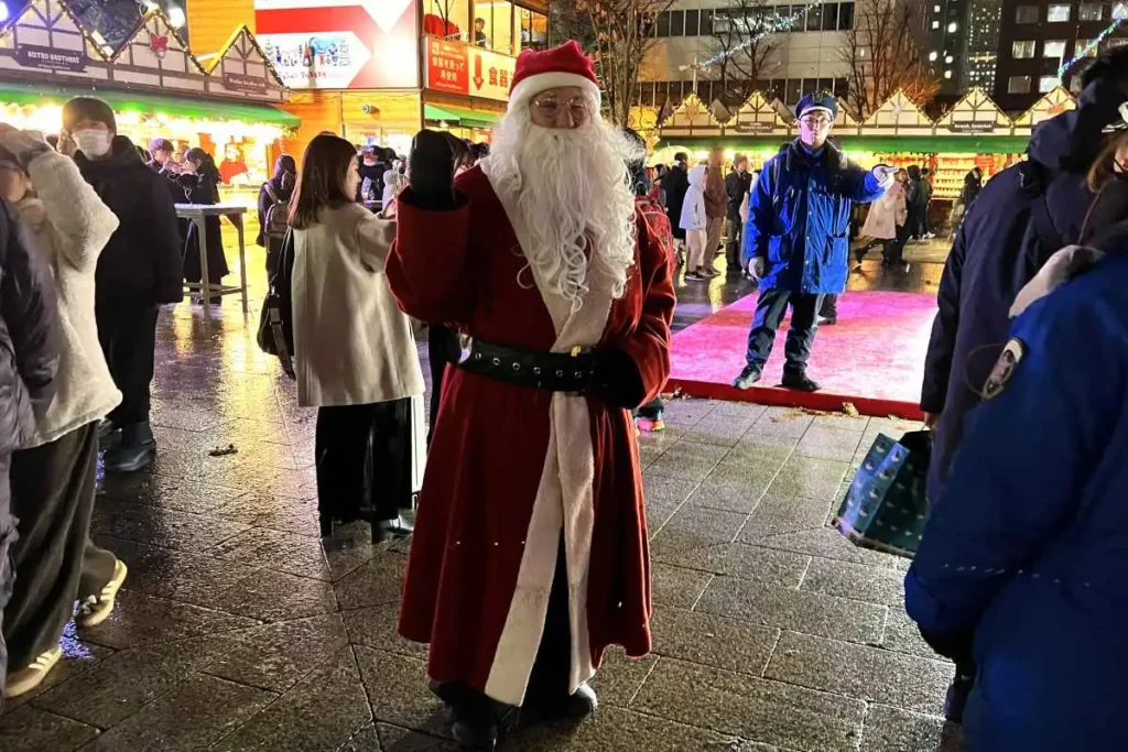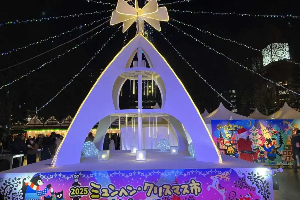 大通公園2丁目では、「2025ミュンヘン・クリスマス市」が開かれており、会場の中央にシンボルオブジェ「Gift of Snow」が置かれています。クリスマスツリーのような形で、温かみのあるシンプルな輝きです。初日の11月21日(金)には午後5時すぎにサンタクロースが登場。オブジェを背景にサンタクロースと写真撮影をする人たちがたくさんいました。サンタクロースは平日は夕方、土日祝日は午後0時半から6時ころにやってくる予定です。