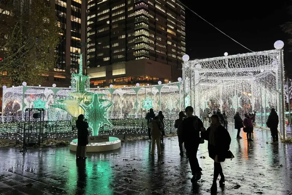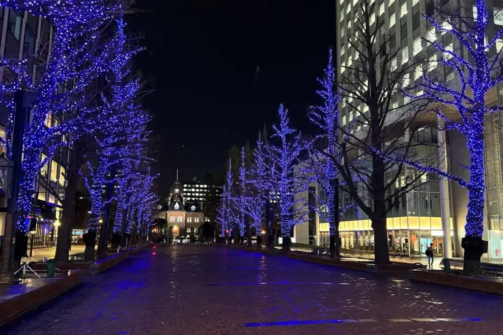 北3条広場(アカプラ)は、南北両サイドのイチョウ並木にLEDを取り付けており、青や緑の光を放っています。駅前通側から眺めると、正面に今年大改修を終えた道庁赤れんが庁舎がライトアップされているのが見えます。一定の時間になると音楽が流れ、音に合わせて光が点滅したり、一斉に点灯したりと、音と光のショーを楽しめます。