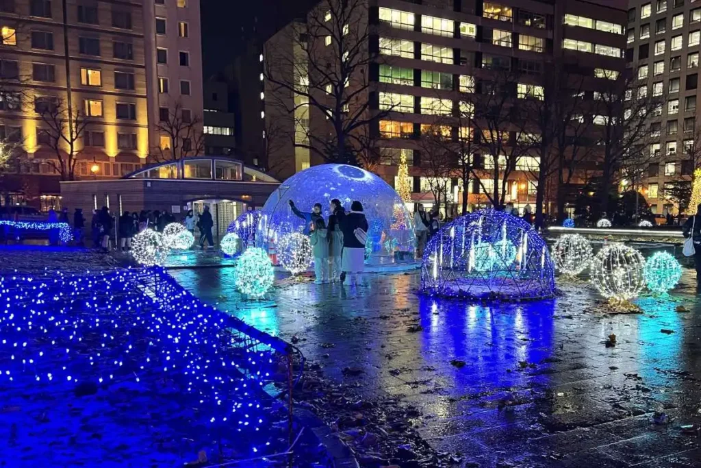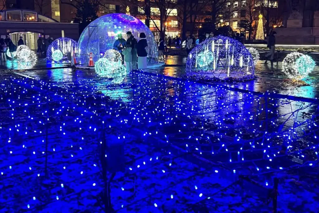 大通公園5丁目は「かなえる未来へ 雪降る『コズミック・スクエア』」がテーマで、宇宙や星をイメージした青色の光で満ちています。光る球体が入った大小のドームがあちこちに配され、球体は人の動きに反応して点滅します。会場いっぱいに幻想的な青の世界が広がり、体の動きに合わせて光がキラキラと連動することで、一体感が楽しめます。