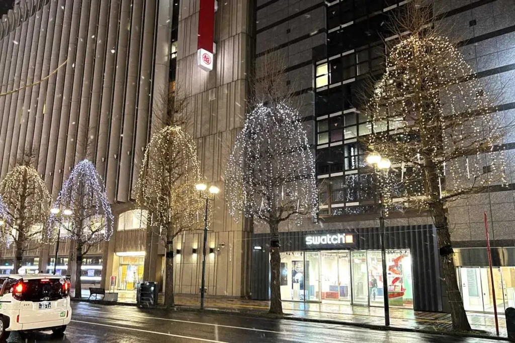 南1条通会場は、西1丁目から西3丁目までの両側のに植えられた街路樹のイチョウ46本に、約7万個のLEDを取り付け、約300メートルにわたって光の道ができています。道沿いの商業施設や車道を走る車のヘッドライトを借景に、ゴールドとシルバーの上品でゴージャスな雰囲気を演出しています。時折、木の上の方から下に向け、水のしずくが落ちるように、光が点滅。きらびやかな空間となっています。