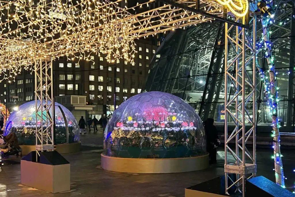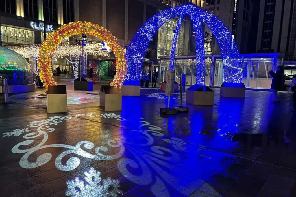 札幌駅南口駅前広場では、大きく透明なドームの中に、イルミネーションに彩られた花々が咲き乱れています。青色やオレンジ色のゲートが配され、光のトンネルも出現。地面にはプロジェクションマッピングのように、花模様が投影されています。札幌の玄関口に色鮮やかな光の花が咲き誇り、白い冬の札幌でも光のお花見を楽しめる華やかな雰囲気が満ちています。