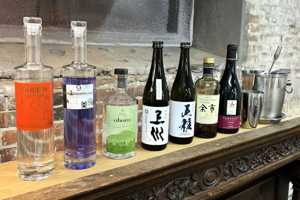 ジンは紅櫻蒸溜所(札幌市)のものやニセコ蒸溜所(ニセコ町)の「ohoro GIN」、ウイスキーはニッカウィスキーの「余市」をそろえ、日本酒も上川大雪酒造(上川町)の「上川」や同社が運営する函館五稜乃蔵(函館市)の「五稜」と、北海道産のお酒がずらりと並びます。