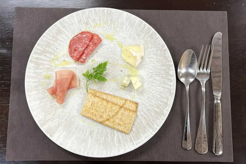 一足早く、試食の機会がありました。最初にチーズとハム。チーズ3種類と生ハム、ソーセージ、クラッカーが一皿に盛られ、乾杯の後にちょっとつまむのにぴったりです。