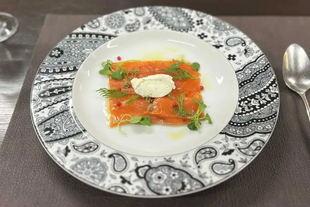 続いて、スモークサーモン。たっぷりの量のスモークサーモンに、クリームチーズが添えられ、散らされたディルやケッパー、ピンクペッパーなどと一緒に「味変」しながら楽しめます。