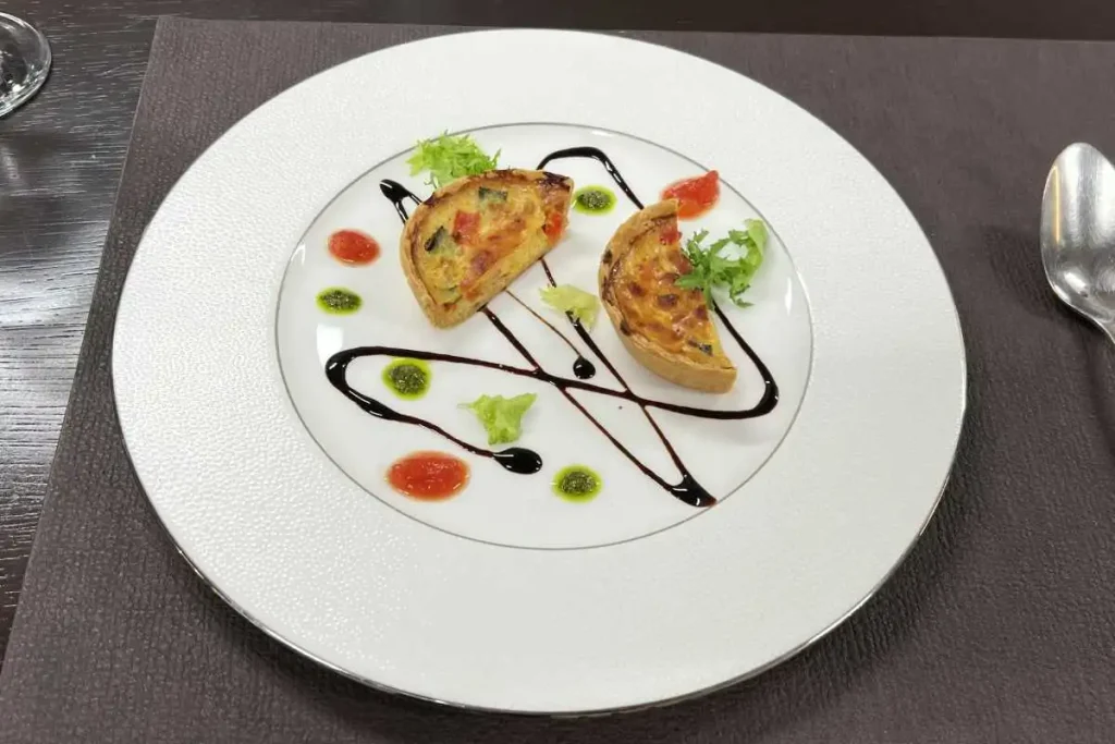 次にサーブされたのは、野菜とベーコンのキッシュ。バルサミコとジェノベーゼ、トマトの3種類のソースが添えられ、見た目もカラフルで、味も3種類のバリエーションが楽しめます。