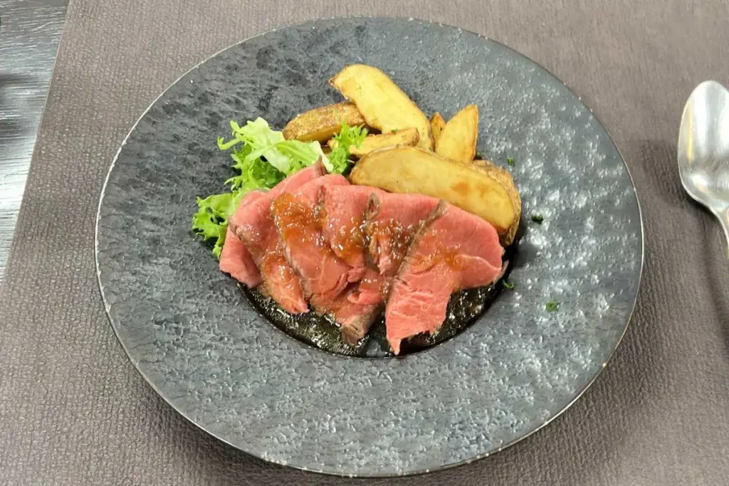 メインはローストビーフ。気前よくたっぷり盛り付けられており、大ぶりのポテトフライが添えられ、ボリュームも十分。火入れもちょうど良く、柔らかいながらしっかりと赤身のおいしさを感じられます。