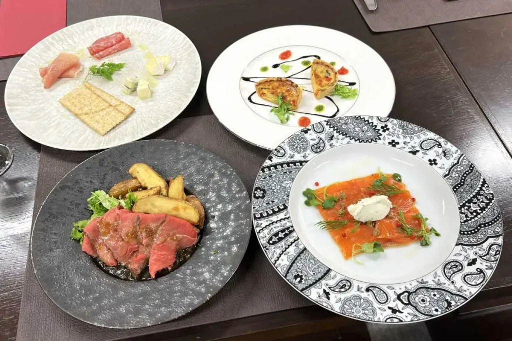 この日のワインは、ミソノヴィンヤード(余市町)の泡「ナイアガラ2023」とリタファーム・ワイナリー(余市町)の白「十六夜2024」、馬追蒸溜所(長沼町)の白「ナイアガラ・アンバー」、YAMAZAKI WINERY(三笠市)の赤「ツヴァイゲルトレーベ」。これがフリーに入っているのが驚きです。