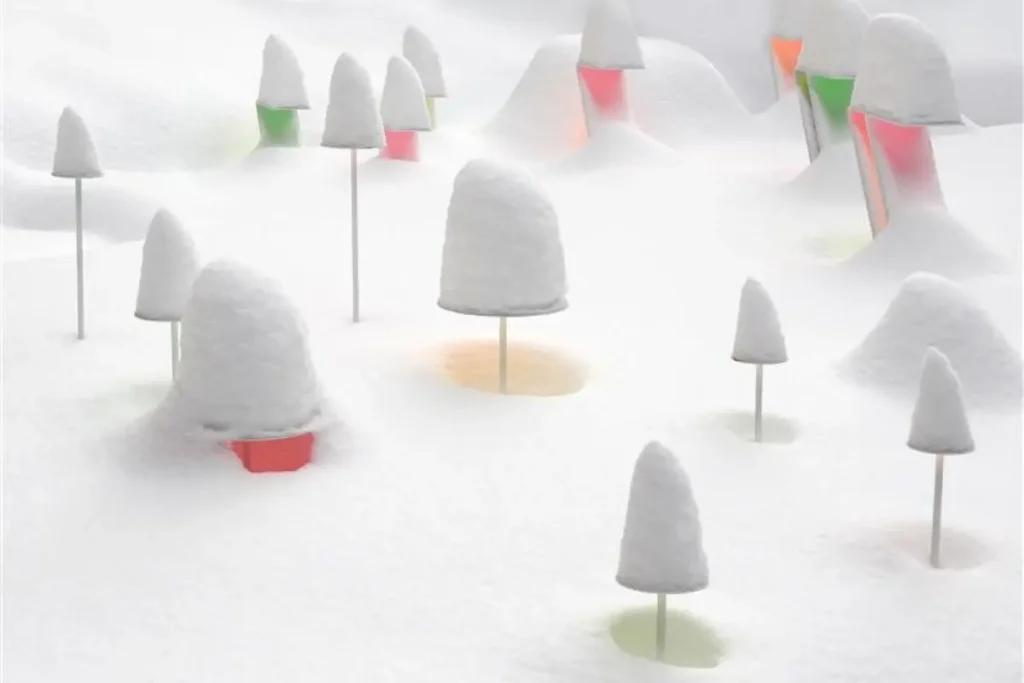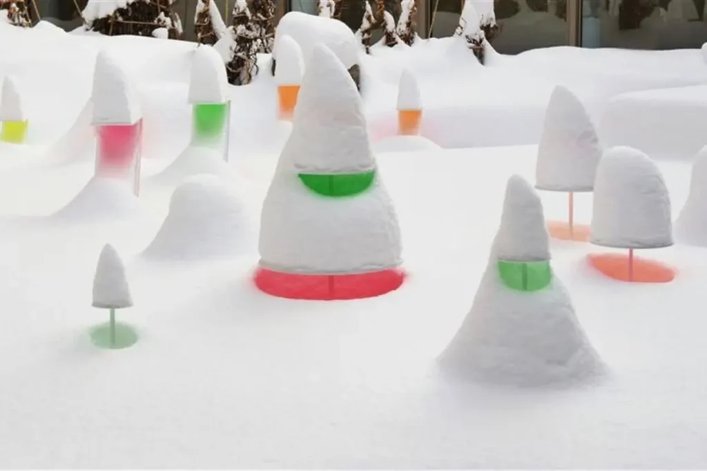 前庭には、雪が降る札幌ならではの造形作品を展示します。札幌市内の美術家で、札幌デザイナー学院学校長の渋谷俊彦さんは「Snow Pallet(スノーパレット)」と題したインスタレーションを毎冬、制作しています。片面に蛍光塗料を塗った円盤形の鉄製のオブジェを設置すると、積もった雪に塗装が反射し、真っ白な雪に鮮やかな色が浮かび上がる仕掛けです。雪の積もり方や光の加減、時間帯などによって色合いが変わり、さまざまな表情を見せます。
