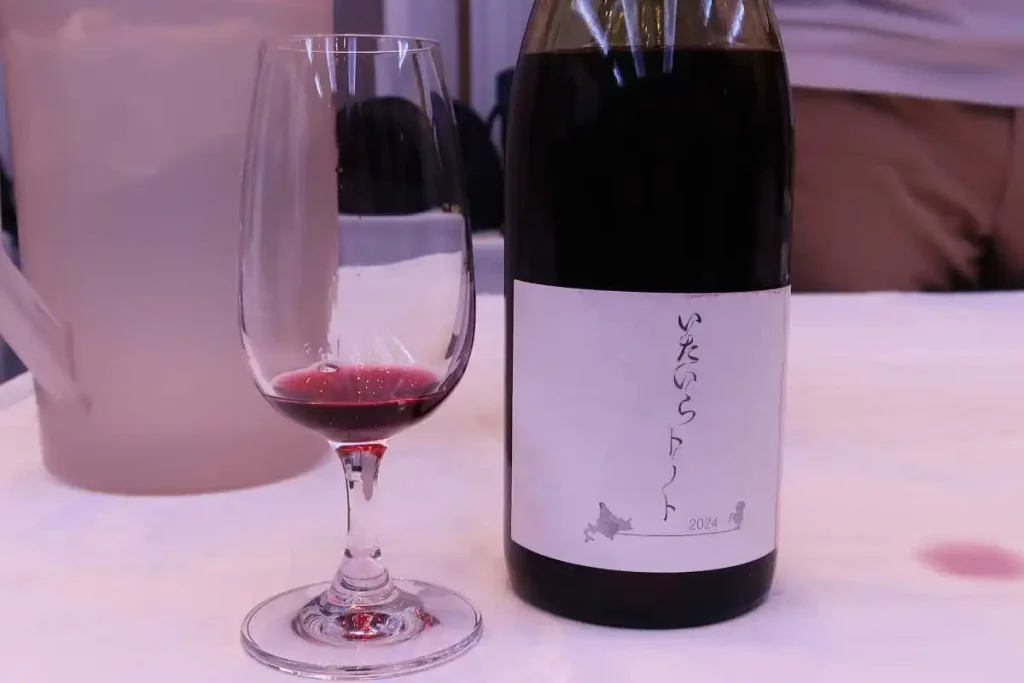 24年には「ブドウのできが良すぎて」(相澤さん)新樽を購入。その新樽で熟成させ、「ブルゴーニュに負けない」と自信を持って勧めてくれたのが「いたいらトノト」。農園のある「帯広市以平でつくられたトノト(アイヌ語でお酒)」から名付けたそうです、山幸100%ですが、一口飲んで、驚きました。どっしりとしたボディ。山ブドウ特有の青っぽい香りもなく、ヴィニフェラとしか思えません。後味にはすっきりとした酸を感じます。選果と手作業の徐梗を徹底した結果だといい、相澤さんは「ピノ・ノワールかガメイみたいでしょう」と得意気です。
