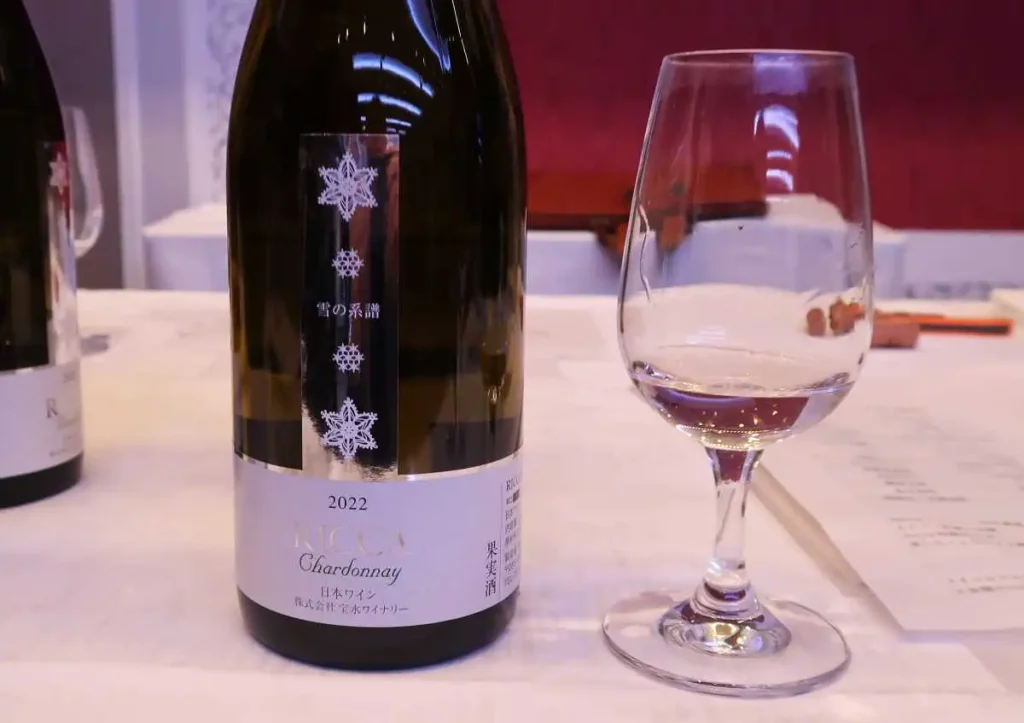 東川町唯一のワイナリー「雪川醸造」は、自社農園のブドウも使っていますが、東川のほかの農家や余市町、石狩市などから買ったブドウを多く使用しています。白「スノーリバーシャルドネHachi樽熟成2024」をすすめてくれました。石狩市でとれたシャルドネ100%で、色合いは黄金色がかった淡いレモンイエロー。ステンレスタンクではなく、樹脂タンクで発酵させた後、新樽で熟成させており、バニラやナッツなど樽由来の香りがあり、はちみつやバターのような膨らみのある風味も漂います。「Hachi」はブドウの産地、石川市八幡からとったそう。