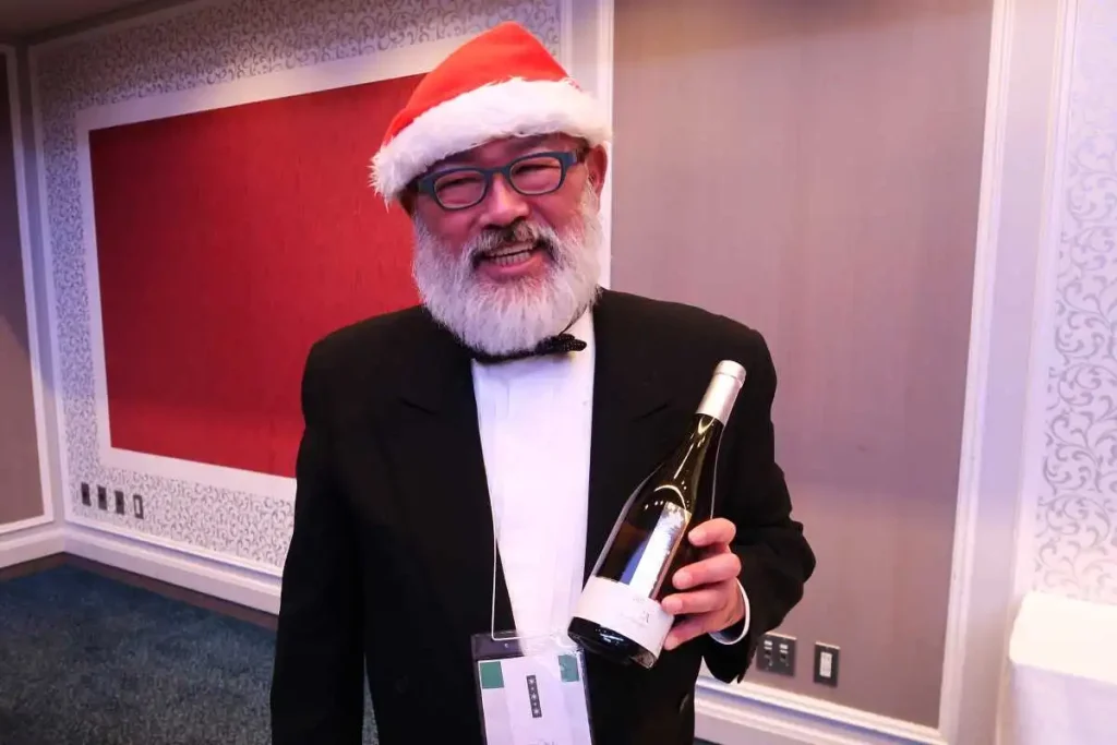 豊かな白いひげをたくわえ、白いフサフサの付いた赤い帽子をかぶった優しそうなおじさん(失礼!)がワインをすすめてくれました。岩見沢市の宝水ワイナリー取締役の杉山幹夫さんです。杉山さんは仕込みの終わったこの時期、札幌市内のデパートの「サンタさん」を務めているそうで、そのためにひげを伸ばしているのだとか。
